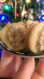Cut rolls into 1/8 inch slices. Place one inch apart on ungreased cookie sheets. Spoon 1/2 teaspoon of the nut mixture onto half the cookies, spread out slightly. Bake for about 6 minutes until edges are set and slightly browned. Remove from sheets and cool. Sandwich the filling between a plain cookie and a nut topped one, with the nuts facing up.