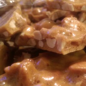 Immediately remove from the heat and stir in the baking soda mixture. Pour unto the cookie sheets and spread about 1/4 inch thick.