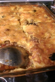 Mix together corn meal, milk and eggs in a small bowl and spread over the meat mixture.